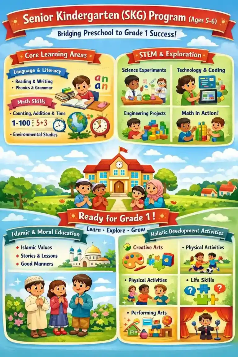In SKG, the curriculum builds on the foundation laid in JKG. Concepts are explored with slightly more depth, and there is a greater emphasis on understanding the “why” behind practices and applying moral lessons in social interactions. This level serves as preparation for more formal Islamic studies in Grade 1.